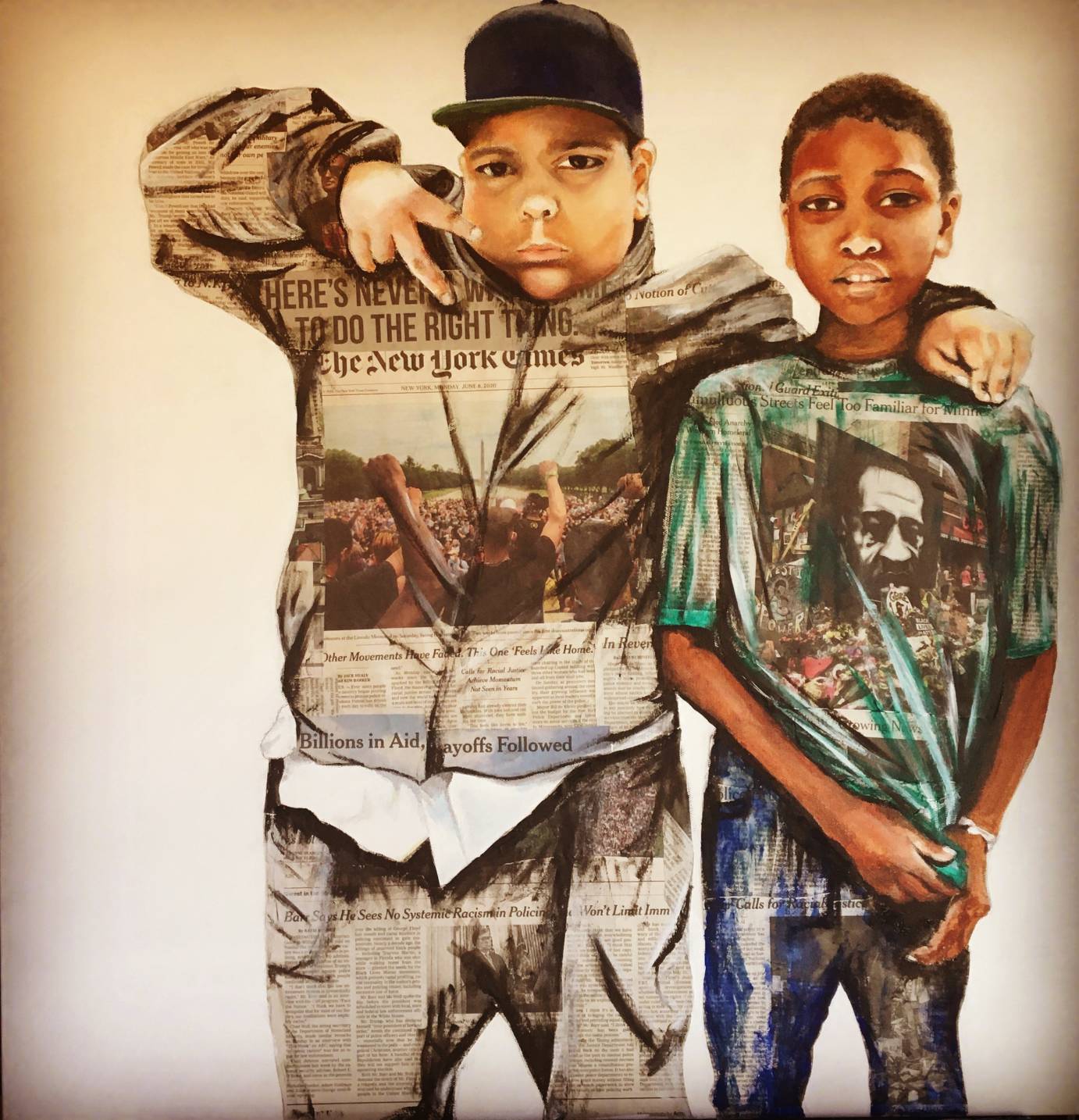 Rebecca Stenn's William and Aboubakari – 30” X 30”, Acrylic and newspaper on canvas