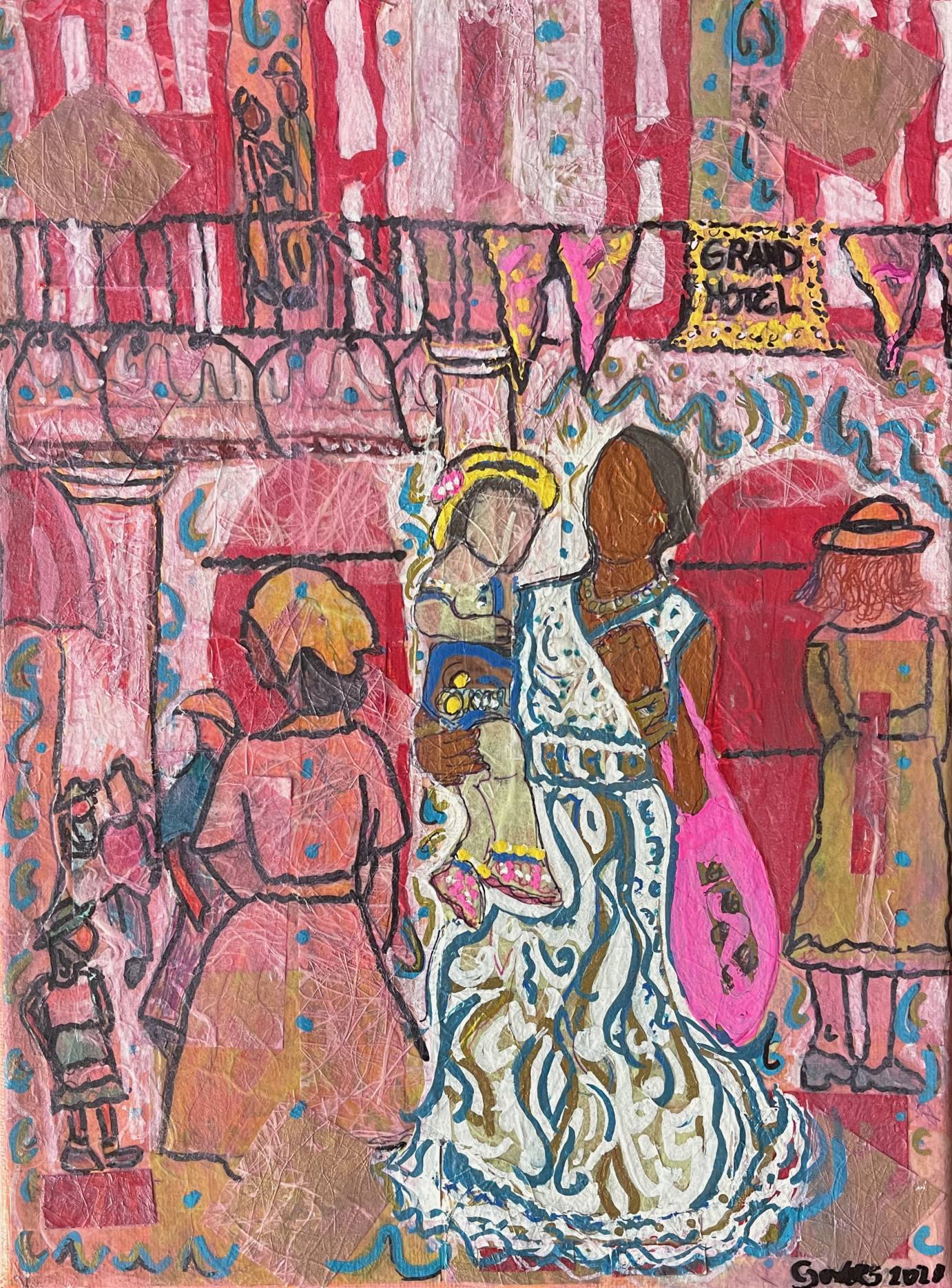 Christine Jowers: I work with whatever I've got. When I take digital photos, I create digital collages. When I travel, I bring sketching materials and watercolor pens (because they are not messy). I have printed some of my designs on silk and cashmere, and also enjoy painting and collaging. Ink and block printing will be my next exploration. There are so many ways to create, and most artists don't limit themselves to one method, because we are an expressive and energetic group.