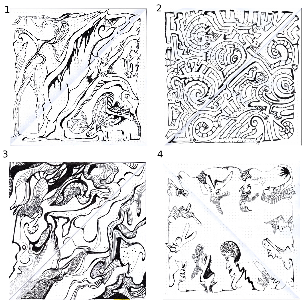 JoAnna Mendl Shaw: I think very spatially when I doodle. Each doodle literally begins with a simple spatial map, which I then fill in. This anecdote from my artist statement might offer more insight to this question:
