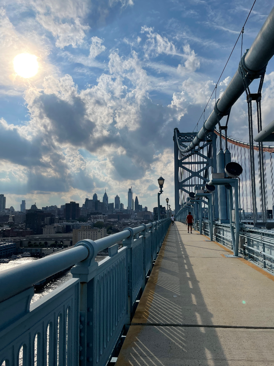 Jody Oberfelder: I love that bridges have a beginning and an end, like life. The precursor to this piece, On the Move Shortly, took place at St. Pancras Train Station in London. This venue was great because people were actually traveling somewhere. We found the best part was when we led an audience member up an escalator for a one-on-one interaction. This lead to Life Traveler. Plus, I just LOVE bridges. They are all different from each other. They afford a view, wind, natural crossings. They go OVER something. You can look out, look down. I choose pedestrian bridges for obvious reasons. There is an old covered bridge in Philly that was very tempting, but I’m sticking with this one really long bridge with dancers staggered along it.