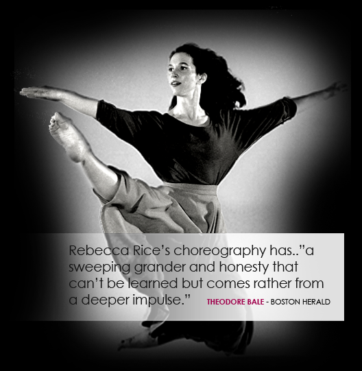 Rebecca spent her early years as a student of classical ballet and Denishawn Dance, training in Massachusetts with her grandmother, Marion Rice, who studied in the early 1900's in Boston and performed with Ruth St. Denis and Ted Shawn. Her work focuses on creating new movement ideas that blend the elegant design-oriented, musical style of ballet with the creative, innovative elements and energy of 21st Century modern dance.She performed her own dance work in France and throughout the United States, including being presented recently by the Jacob's Pillow Dance Festival, Boston's Bank of America Celebrity Series, and the NYC American Dance Guild. Her performances received the Best of Boston awards from both the Boston Herald and the Boston Phoenix in 2003. Tedd Bale of the Boston Herald says Rebecca's work is "extraordinary…inventive…stunning."