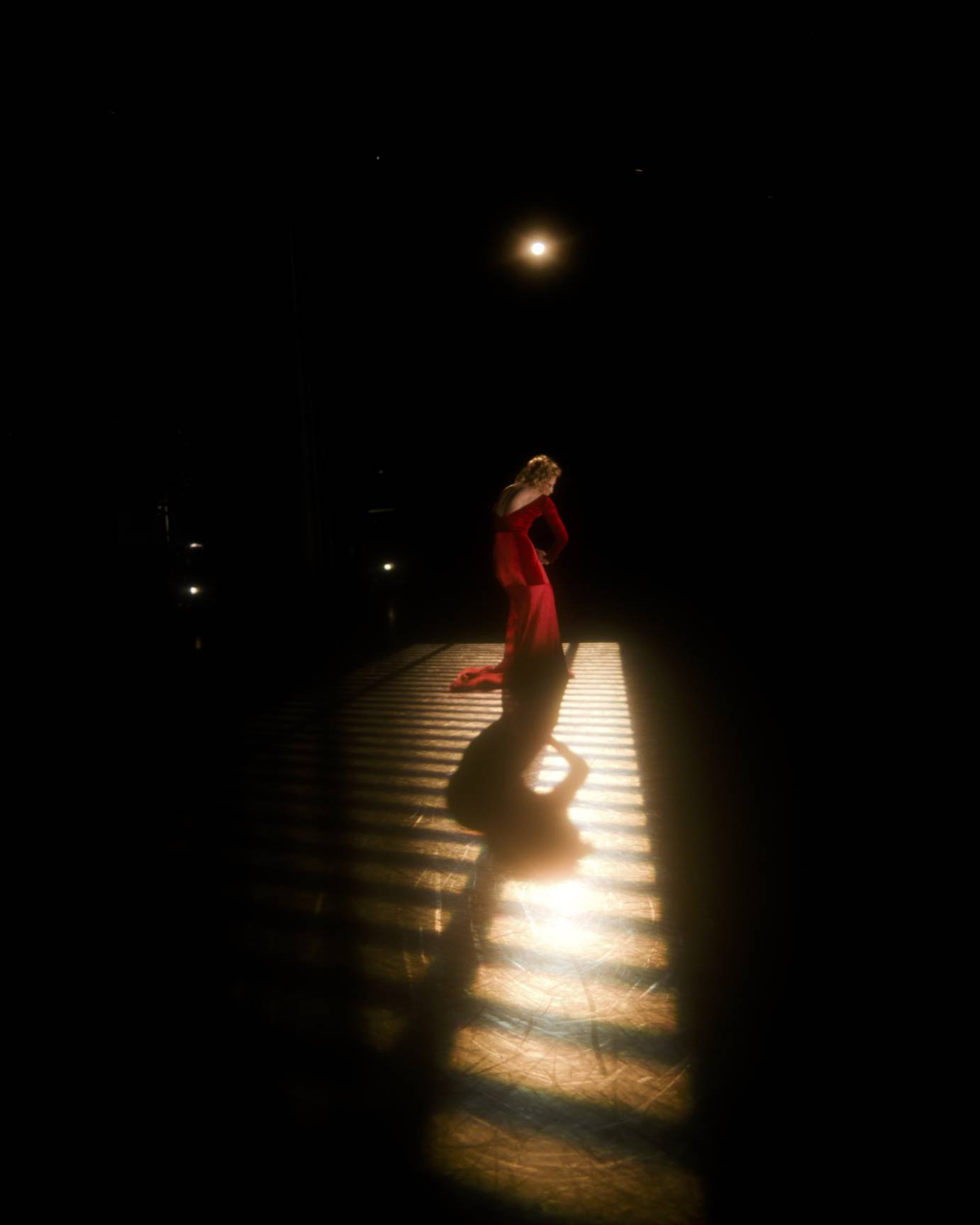 Whiskey Noir (the next little girl), performed sublimely by Clymene Aldinger, speaks to temptation while feeling trapped. Aldinger, dancing through a diagonal of light wears a long, red dress which covers her feet. Throughout the work, she deliberately lifts her skirt to articulate to the tips of her toes, delicately taking her first steps towards a hidden something.