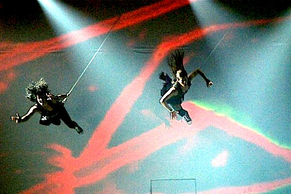 KF: Grounded Aerial is very much about dancers who happen to fly. We're not trained circus performers (not that anything’s wrong with that). Our background is as technically trained dancers with a ballet core. There is always a theatrical base. We never are presentational only to create a "wow" factor. My work is character driven and that is essential There is not one piece where a performer doesn’t have a character. Why we are doing what we do is all based on character. The character levitates for a reason, not for presentational purposes. Of course, I don’t have anything against that. When there is "wow" factor, like if we jump 20 feet into the air, I am all for it and I love it! But, there has to be a reason for it. That theatrical base is very relevant. It’s the purpose. It’s what pulls us in to the performance.