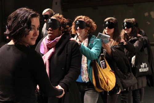 Blindfolded, I clutch the shoulders of the stranger in front of me as I fumble my way into the Irondale Theater. With lack of vision other senses light up and I become hyper-aware of enveloping sounds: feet shuffling, low voices and prolonged hissing noises, which seem just inches from my ear. I am led to my seat by a firm voice and a soft hand. As I sit down, I feel the rise and fall of a stranger's breath.