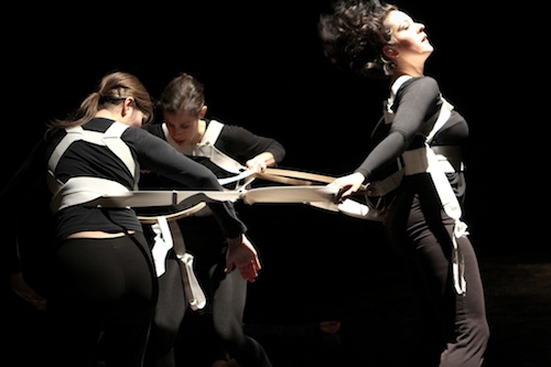 One striking vignettesees a solo performed by a corpse-like figure that has been lying motionless on center stage for some time.A manin a baggy nylon body suitbegins to violently seizure, his arms and legs flying every which way. (Did his thrashing create the thudding noise we heard earlier?) An intriguing trio populates another vignette - three odd women linked together by the wooden honeycomb-like circles. They resemble bizarre ostriches and accompany their movements with strange bird-like noises. Strangely, only at the very end of What We Were Handed do I notice a cellist who has been providing the eerie atmospheric music throughout.