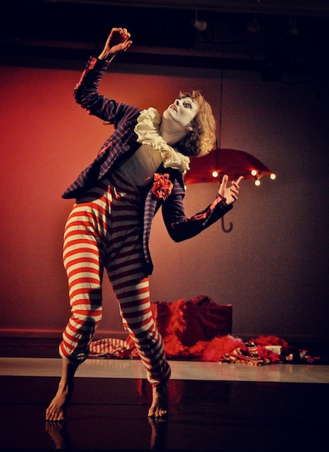 At the start of Oddball Zebra we are introduced to a white-faced clown who merrily dances with and around the other characters on stage. She silently narrates, comments, and translates the stage world for those of us on the outside. By the end of the piece almost everyone in the stage world has transformed into a sad sack Punchinello -- white-faced, wearing stripes, and staring out blankly.