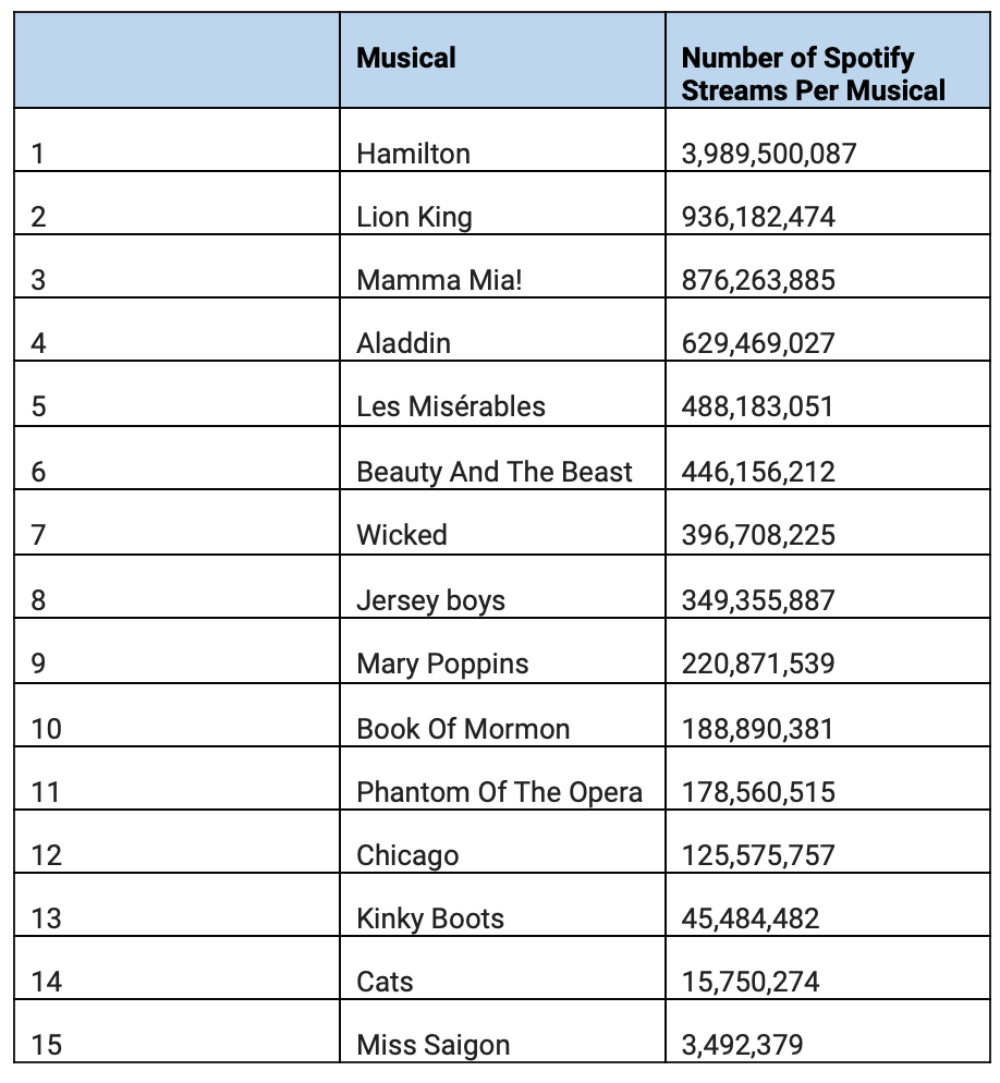 Money.co.uk revealed that the most streamed musical is Hamilton with a whopping 3,989,500,087 streams for all of its songs on Spotify. Hamilton’s most streamed song is its classic opening song Alexander Hamilton which has been streamed 184,576,667 times so far.