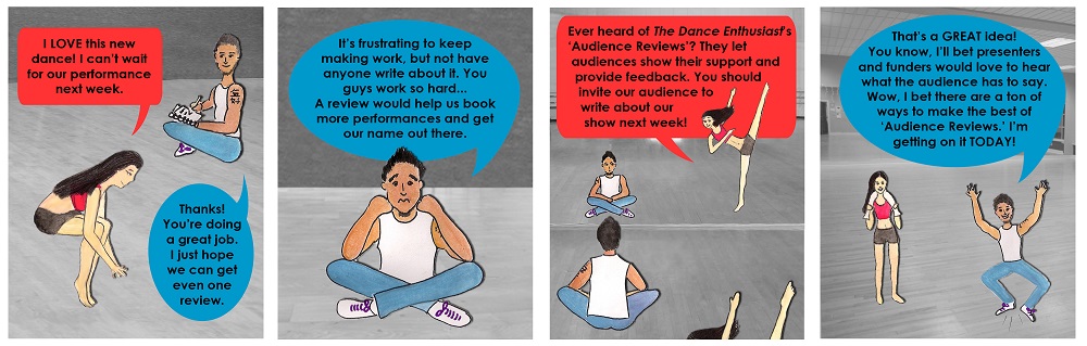 You have a room full of people about to watch your performance. Let them know you'd like to hear their response to your work in The Dance Enthusiast Review section.TIP: a. Include an insert or text in your playbill with information about The Dance Enthusiast Audience Review section. (We have postcards for you to insert if you would prefer)